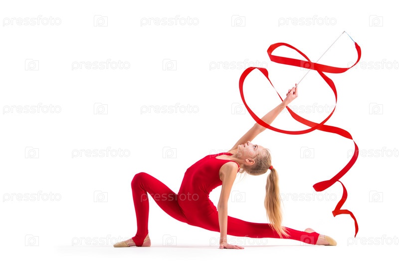 Девушка-гимнастка в красном комбинезоне делает упражнения с лентой на белом фоне, изолирует