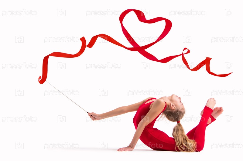 Изолированные на белом фоне Девушка гимнастка в красный комбинезон делает упражнения с лентой, лента закручивается в сердце