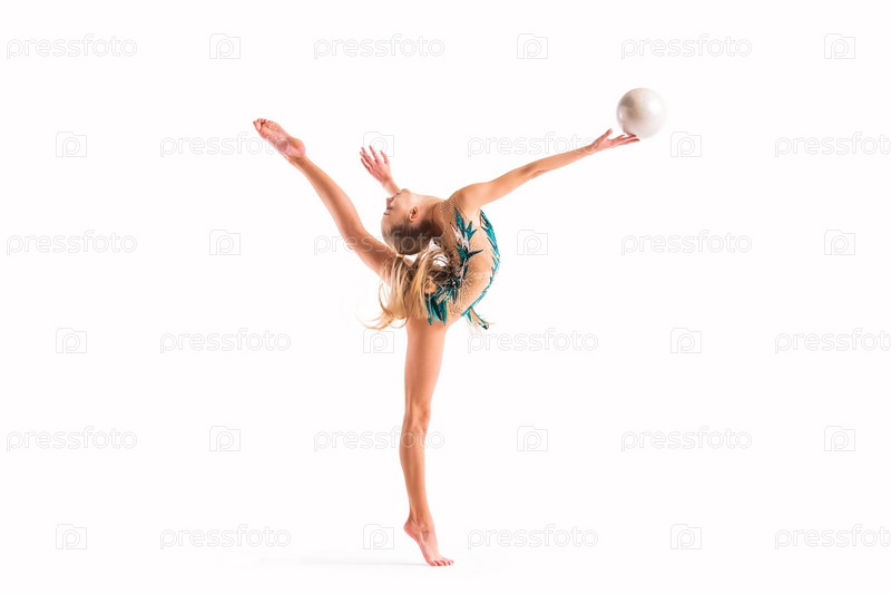 Гимнастка в изумрудном купальнике выполняет упражнение с мячом на белом фоне