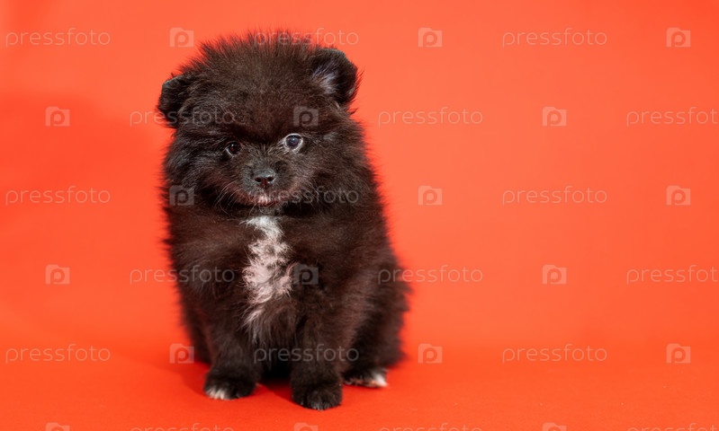 Милый маленький щенок померанского шпица сидит на красном фоне. Пушистый щенок