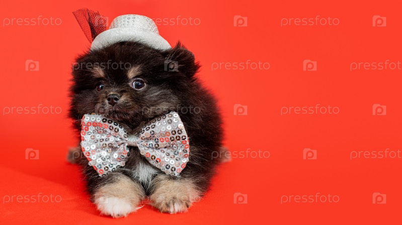 Милый маленький померанский щенок сидит на красном фоне в блестящей шляпе и галстуке-бабочке. пушистый щенок