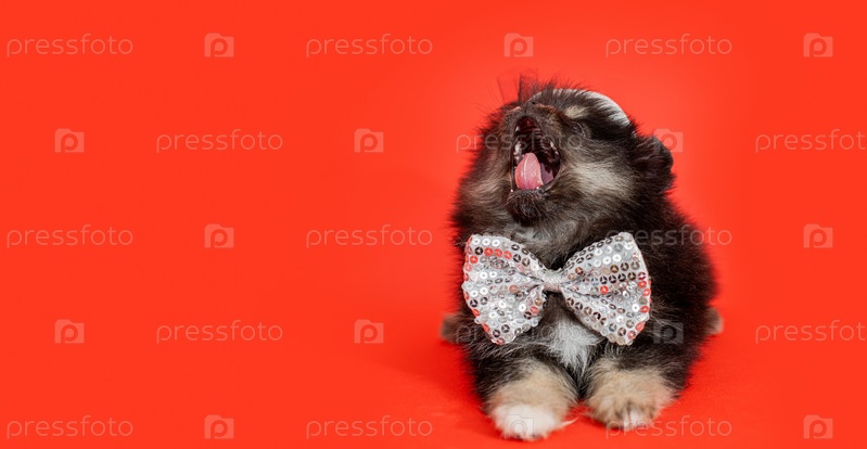 Милый маленький померанский щенок сидит с открытым ртом на красном фоне в блестящей шляпе и галстуке-бабочке