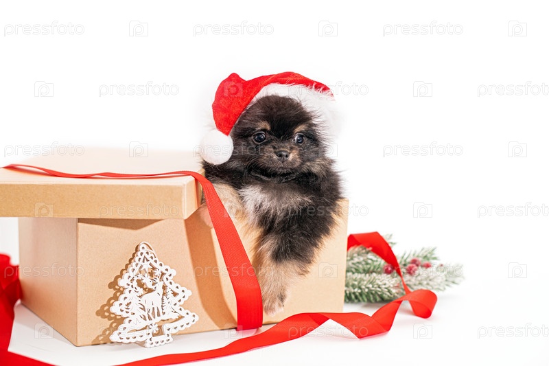 Милый пушистый щенок шпица в шапке Санта-Клауса выглядывает из большой подарочной коробки с красной лентой на белом фоне