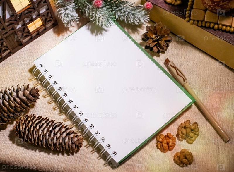 Блокнот и ручка лежат среди сосновых шишек, грецких орехов и рождественских украшений, макет