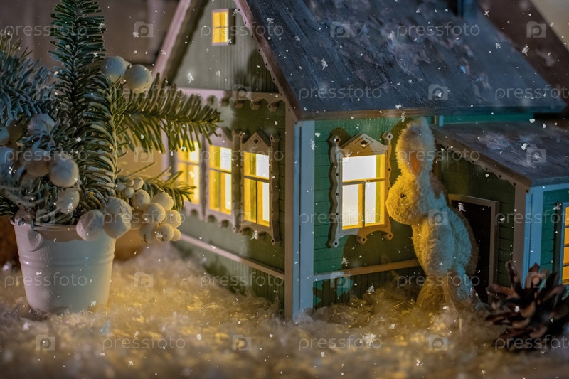 Посреди зимнего пейзажа игрушечный кролик заглядывает в окно деревенского дома возле рождественской елки