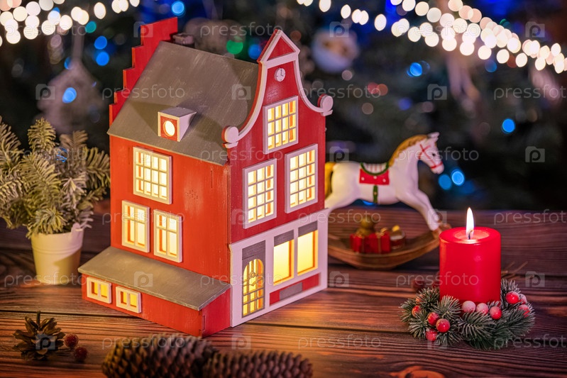 Праздничная композиция из лампы в виде старинного европейского дома, игрушечной лошадки, еловых веток и шишек на фоне расфокусированных гирлянд