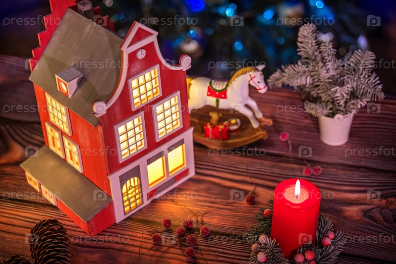 Праздничная композиция из лампы в виде старинного европейского дома, игрушечной лошадки, еловых веток и шишек на фоне расфокусированных гирлянд