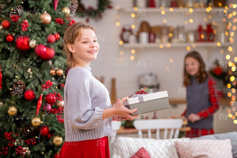 Веселая девочка-подросток с коробкой с подарком в руках дома на фоне рождественской елки
