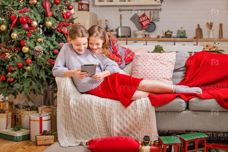 Две радостные сестры сидят дома возле елки и смотрят на монитор планшета