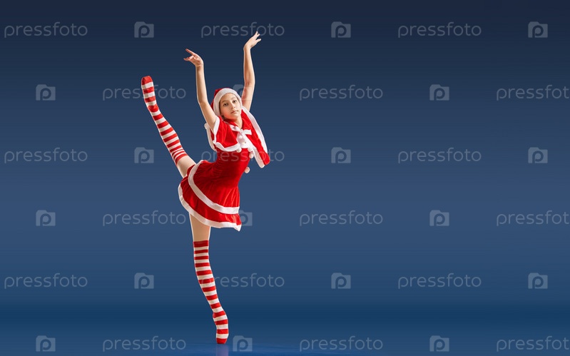 Танцующая балерина с подарком в руках на пуантах в костюме Санта-Клауса на синем фоне