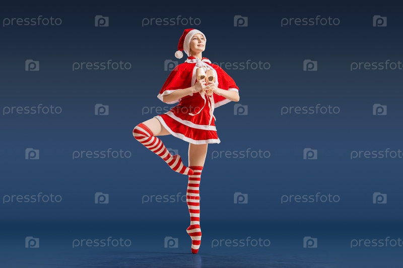 Танцующая балерина с подарком в руках на пуантах в костюме Санта-Клауса на синем фоне