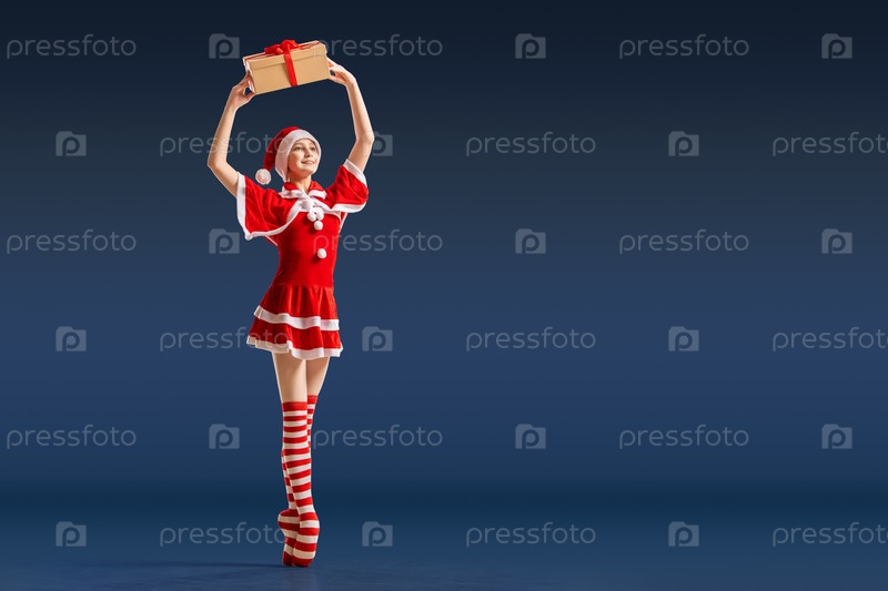 Танцующая балерина с подарком в руках на пуантах в костюме Санта-Клауса на синем фоне