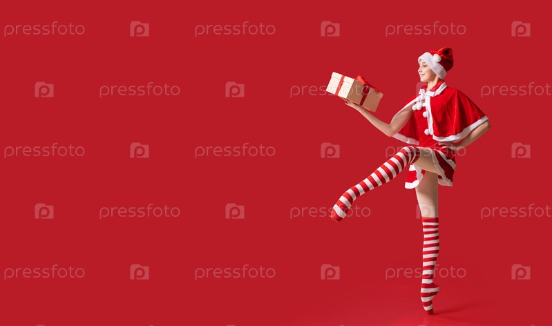 Танцующая балерина в пуантах с подарком в руках, одетая как Санта-Клаус на красном фоне