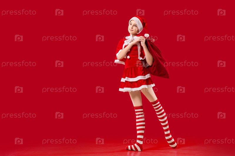 Танцующая балерина в пуантах с подарком в руках, одетая как Санта-Клаус на красном фоне