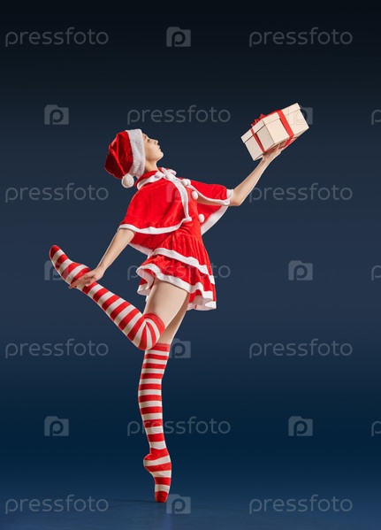 Танцующая балерина с подарком в руках на пуантах в костюме Санта-Клауса на синем фоне
