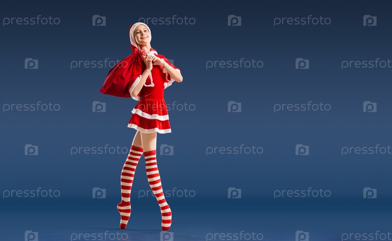 Танцующая балерина с подарком в руках на пуантах в костюме Санта-Клауса на синем фоне