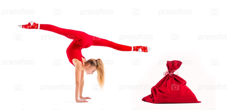 Стройная гимнастка в красном облегающем костюме и шапке санта-клауса позирует рядом с сумкой для подарков на белом фоне