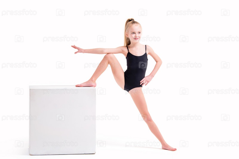 Маленькая гимнастка в черном купальнике, стоящая одной ногой на белом кубе, изолированная на белом фоне