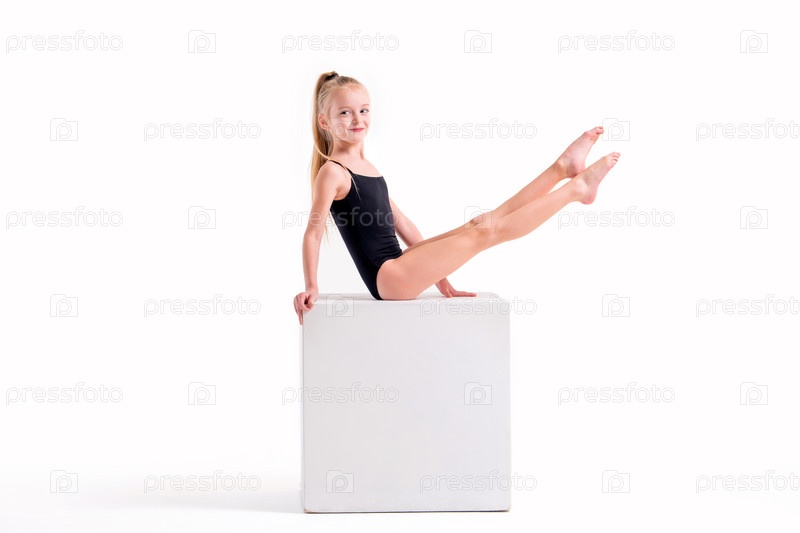 Маленькая гимнастка в черном купальнике выполняет упражнение на белом кубе, изолированном на белом фоне