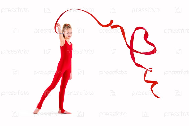 Стройная гимнастка в красном комбинезоне делает упражнения с лентой на белом фоне, изолирует