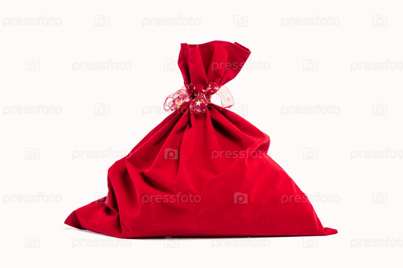 Красный бархатный рождественский мешок Санта-Клауса для подарков, изолированных на белом фоне