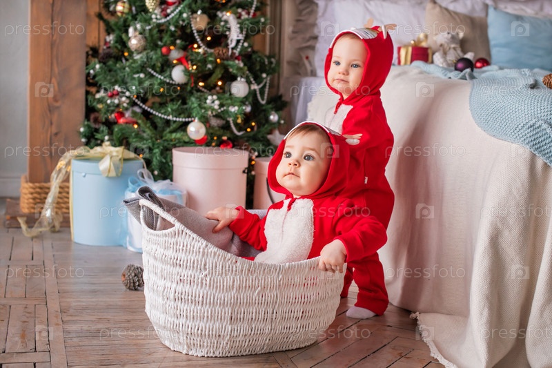Малыши-близнецы в красных костюмах оленей Санты сидят рядом друг с другом дома на фоне рождественской елки