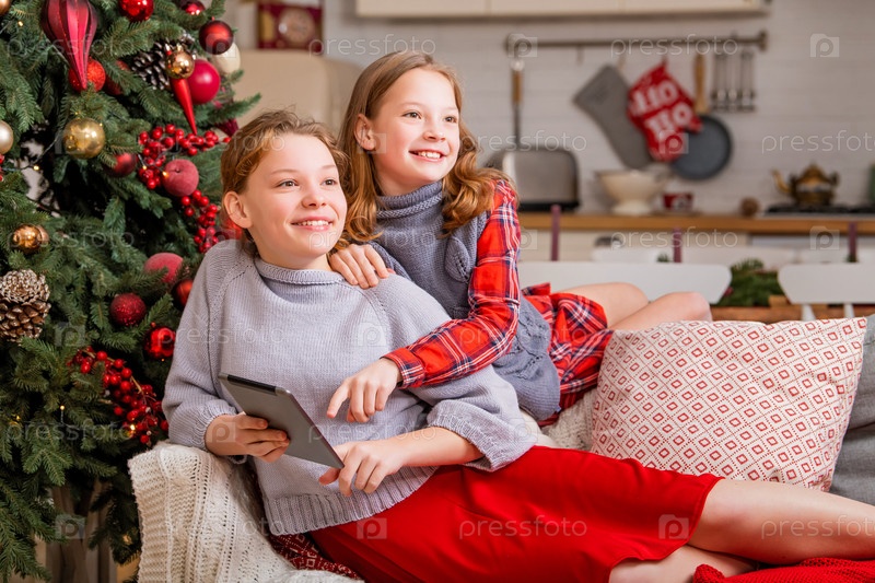 Две радостные сестры сидят дома возле елки и смотрят на монитор планшета