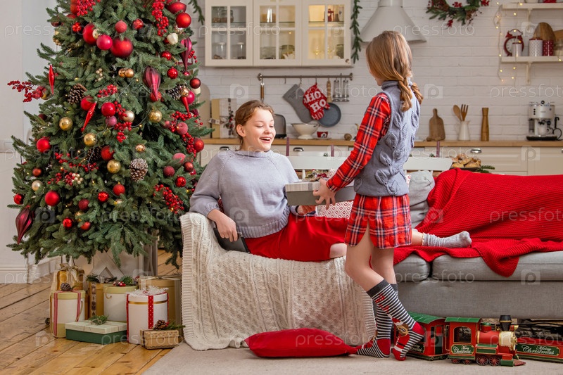Две веселые сестры сидят дома возле елки и поздравляют друг друга с Рождеством, дарят подарки