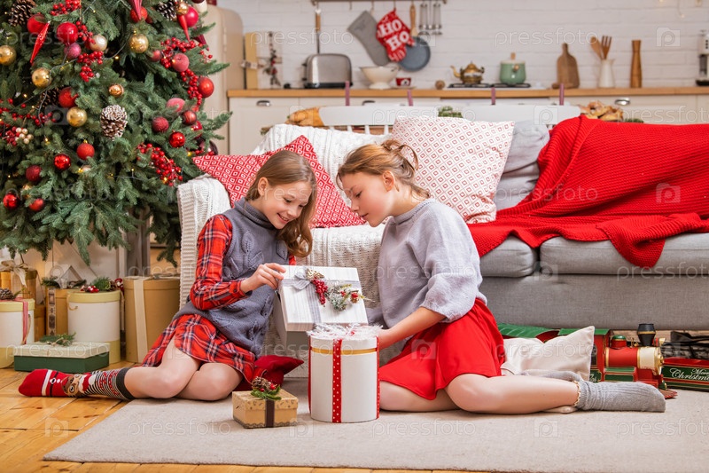 Две радостные сестры сидят дома возле елки и смотрят на коробки с подарками