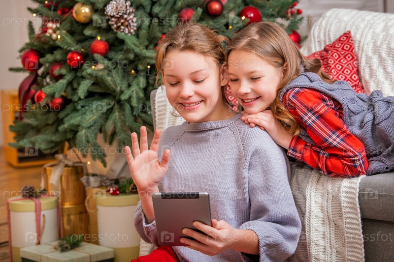 Две радостные сестры сидят дома возле елки и смотрят на монитор планшета