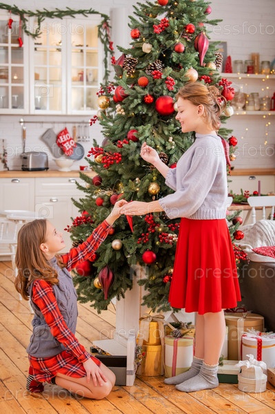 Две веселые сестры-подростки украшают елку дома в комнате