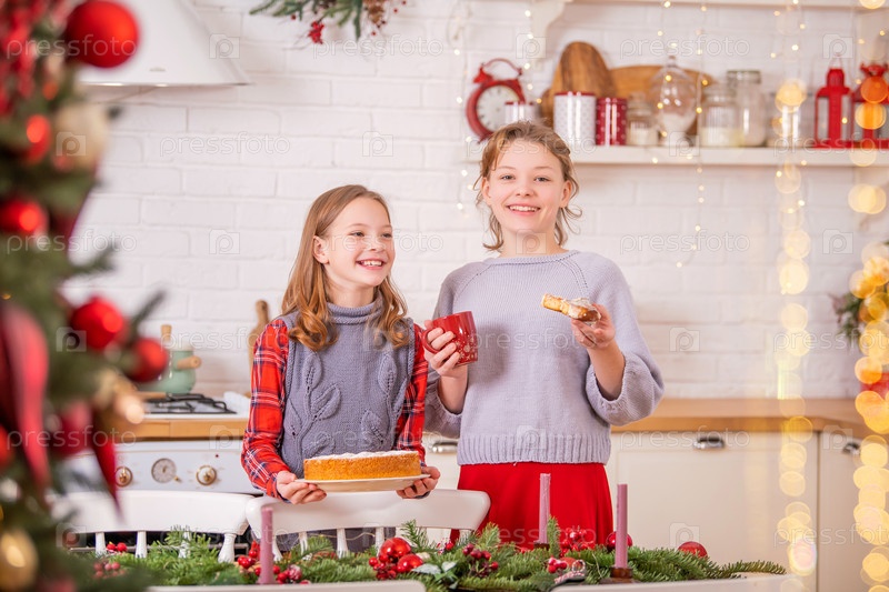Две счастливые сестры украшают рождественский стол дома на кухне, держа в руках чашки и сладкие пироги