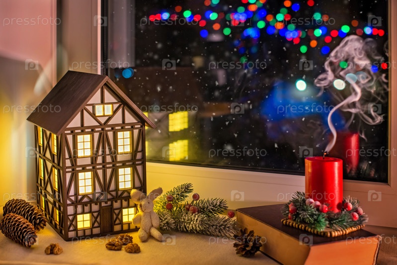 На подоконнике ночник в виде фахверкового домика среди елочных украшений, дымок от красной свечи на фоне окна ночного снега