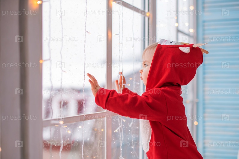 Ребенок в красном костюме оленя Санты смотрит в зимнее окно