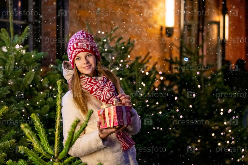 Рождественский портрет красивой девушки в теплой одежде и шарфе, стоящей на улице, украшенной к Новому году, на фоне елки с подарком в руках
