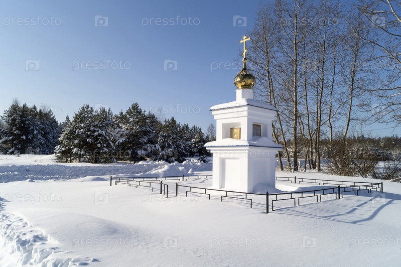 Бланширующая часовня с золотым куполом и крестом на фоне дерева