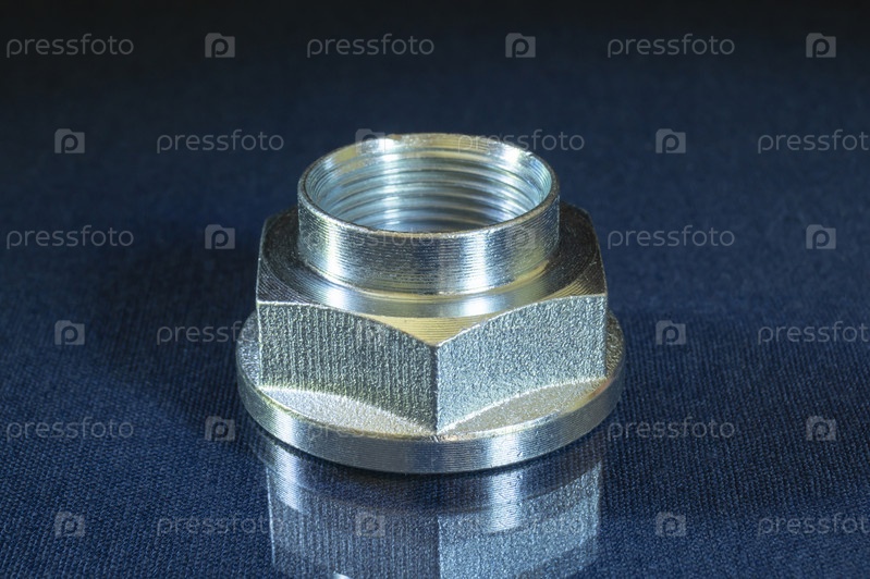 Металлическая гайка с резьбой на столе с отражением