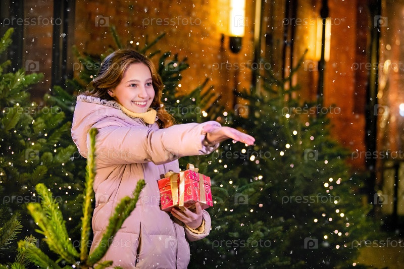 Красивая девушка в теплой одежде с подарком в руках ходит по улице, украшенной к Новому году среди деревьев, ловит снежинки на ладони