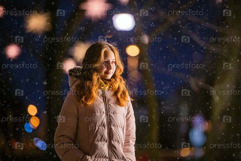 Милая маленькая девочка гуляет по ночному праздничному городу во время снегопада