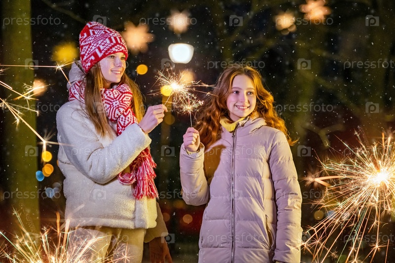 Компания веселых девочек-подростков гуляет по ночному тусовочному городу во время снегопада, зажигая бенгальские огни