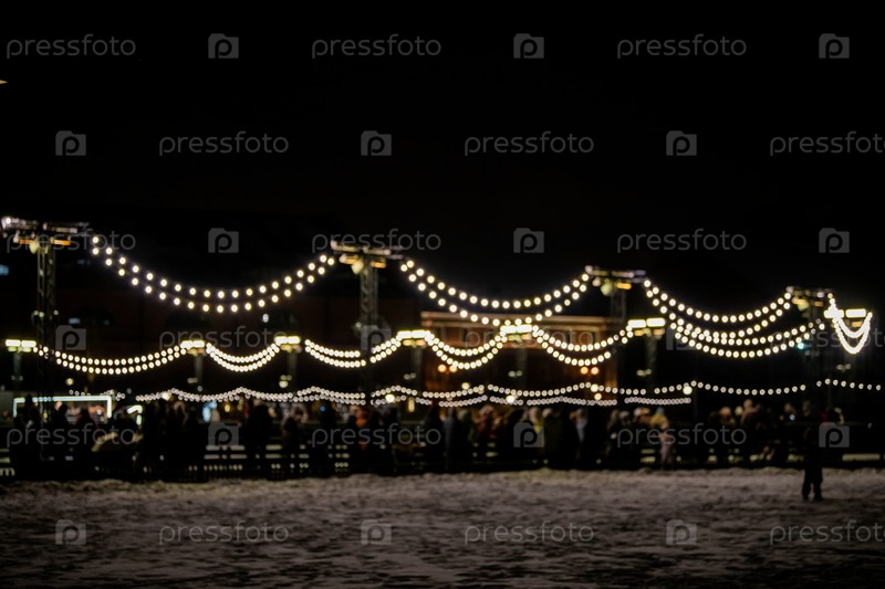 Абстрактный размытый фон с красочными кругами боке. Городской образ жизни на фоне уличных фонарей и рождественских гирлянд зимой