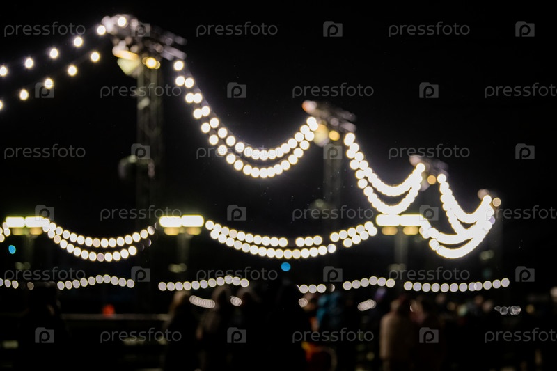 Абстрактный размытый фон с красочными кругами боке. Городской образ жизни на фоне уличных фонарей и рождественских гирлянд зимой
