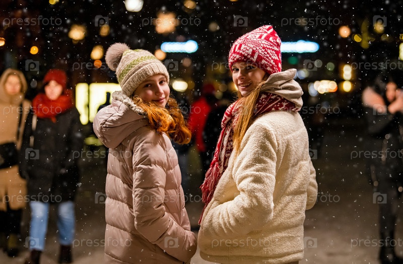 Две хорошенькие девушки идут по зимней заснеженной вечерней улице среди толпы людей, обернувшись, чтобы заглянуть в кадр