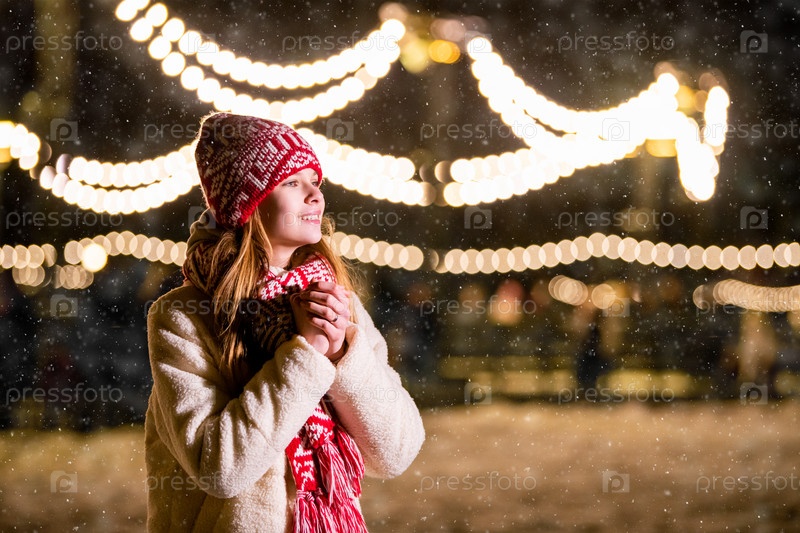 Милая девушка ходит по ночному праздничному городу во время снегопада, потирает замерзшие руки