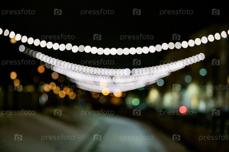 Абстрактный размытый фон с боке красочные круги. Фон городского образа жизни с уличными фонарями и гирляндами