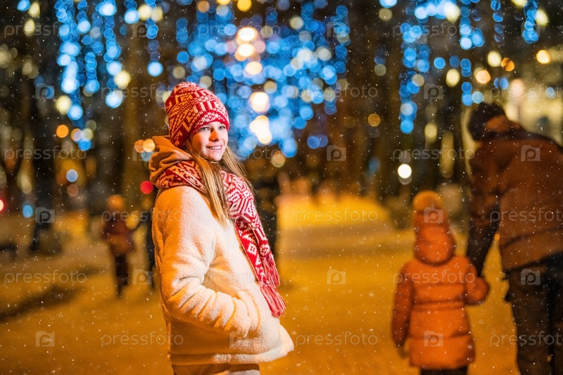 Симпатичная девушка идет по зимней заснеженной вечерней улице разукрашенного города, обернувшись, чтобы заглянуть в кадр
