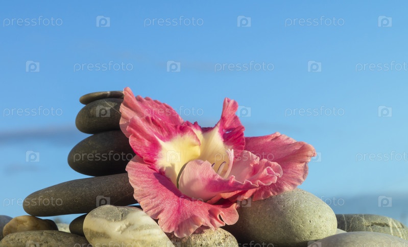 Цветочный гладиолус на камне в яркий солнечный день