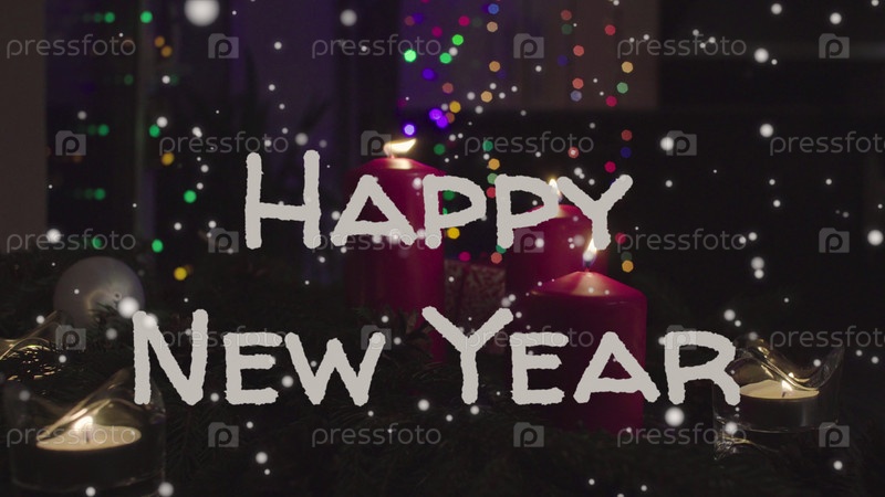 Новогодняя открытка. Зажженные свечи и гирлянда в темной комнате