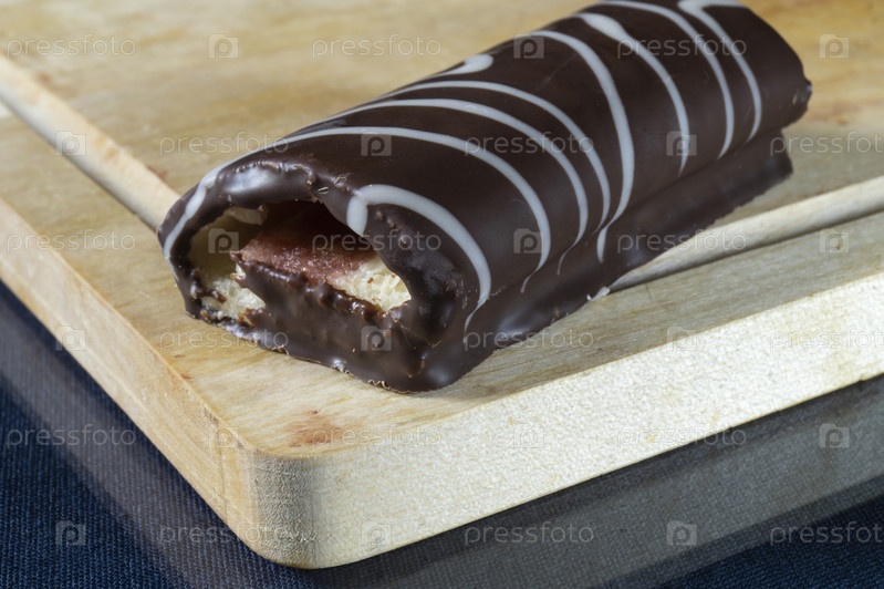 Сладкий рулет на деревянной доске на кухне