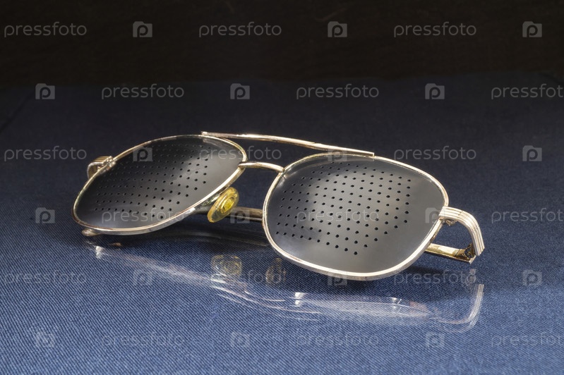 Очки с отверстиями для лечения близорукости на столе с отражением
